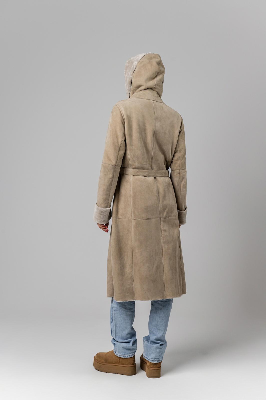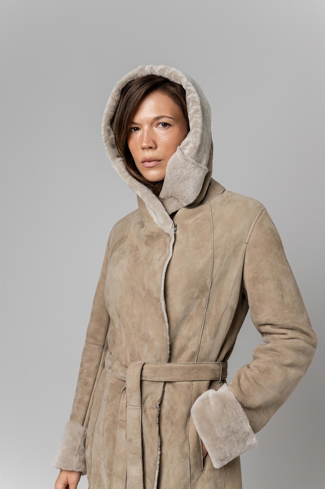 Long hooded fur coat with two pockets.